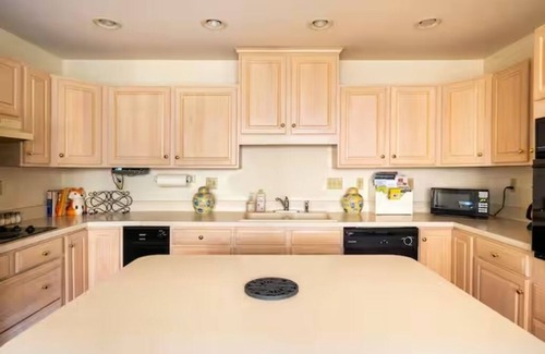 new beds, bedding, and towels Large laundry room with iron and ironing board. Kitchen is stocked with cooking implements, plates, utensils, and spices..