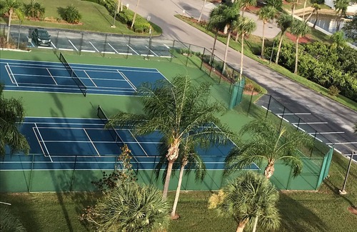 watch the amazing sunsets right from your private balcony, the community sunset park or from our incredible olympic size heated and cooled saltwater pool! dolphins, manatees, ospreys, eagles are regular residents and visitors Walk the Nature Trail, lounge on the lagoon private beach, play pickleball and tennis! Excellent fishing from the sea wall and Nature Trail Bridge. 50 acres of lovely grounds to explore for those morning and evening walks.