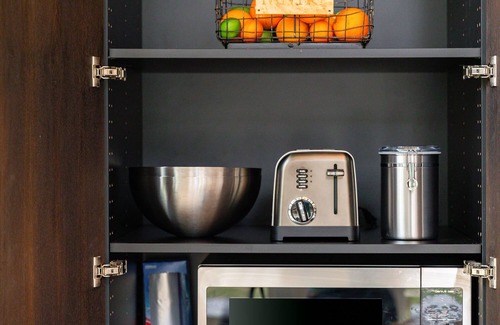 cookware/appliances: microwave, crock pot, blender, 2 slice toaster