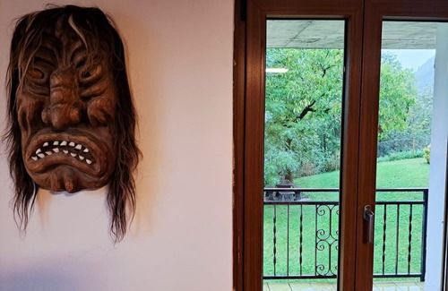 this cozy mountain accommodation combines the charm of tradition with modern comfort Original elements such as the large stone fireplace, wood-burning stove, and ceramic floors tell stories of the past and create a warm and homely atmosphere. The bright living room, with its comfortable double sofa bed and large wooden table, is perfect for relaxing and sharing special moments (Please note: the sofa bed is not prepared, we think it is proper to use the sofa during non-sleeping hours. You will find sheets, pillows and blankets in the closet/shelf most adjacent to the sofa). The French door opens onto a spacious covered balcony overlooking the garden and forest, offering enchanting views throughout the day. The separate and fully equipped kitchen provides everything you need to cook like at home. It also has access to the outdoor space, ideal for enjoying the sun and fresh mountain air. The sleeping area includes one double bedroom and one single, both with wooden floors and windows framing the alpine landscape. The bathroom, compact yet functional, is equipped with a practical shower.