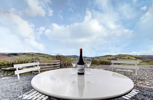 outside – enclosed patio area along the front of the two cottages with a central porch area creating a private corner for each cottage Gorgeous views across the valley towards the Cambrian Mountain range with no road or car in sight. Garden furniture and barbeque provided. There is also a further enclosed garden with play area next to the property.