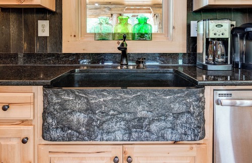 with a wall of large west facing windows you can enjoy grand mountain views from inside the vaulted great room while relaxing around the cozy wood stove (full cord of firewood stored next to driveway) On those rainy days, browse the large great room book collection containing literary classics and new releases and read a book while relaxing in the Amish rocking chairs. A large selection of games, puzzles and DVDs are also available. This is the traditional mountain cabin of your dreams with red canoe hanging from great room rafters, mounted trout displayed over large smart TV and quirky (but not real) wildlife hiding throughout the house.