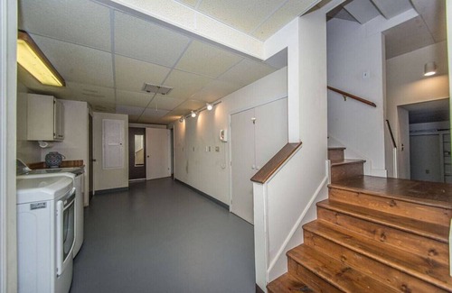 this vacation rental has spacious common areas, a first level queen size bedroom, full bathroom, sunken living room with wood burning fireplace, dining room, kitchen and magnificent great room which can easily be used for yoga, group meetings or general relaxing When you head upstairs you will find a Queen bedroom, full bathroom with tub, and large 'dorm room' with 2 twin trundle beds for 4 single guests or it can be used as a great kids room. The catwalk provides a quiet sitting space suitable for reading, meditation or looking down into the sunken living room. Enjoy a peaceful gathering on the large decks outside or have a grill night with the large gas grill provided for guests. The screened in deck area off of the great room provides a bug free getaway during summer nights. The basement is a utility basement (for the time being) but we have big plans coming!!! Downstairs you will find a 1/2 bathroom and laundry machines as well as the trash holding area.