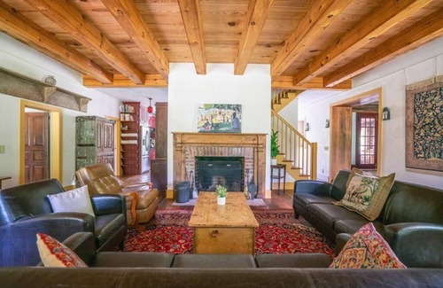 Located in Highland, NY, and nearby to New Paltz and Poughkeepsie, this home is private with 50 acres of property. Enjoy the peace and quiet of the great outdoors and easy access to nearby activities. The home, which features vintage and antique touches balanced with modern and high-end finishes, includes four bedrooms, an open-concept chef’s kitchen, and a butler’s pantry as well as an outdoor shower and swimming pond.