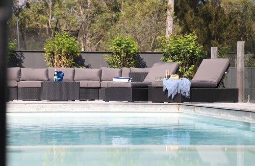outside, the magic continues, make the most of sunny days in the stunning swimming pool or gather for long lunches in the expansive outdoor entertaining space—complete with a gas bbq and generous seating for relaxed al fresco dining Children will love the dedicated play area, featuring a trampoline, sandpit, and slide, while pets have plenty of room to roam on the back lawn. With parking for up to 8 vehicles, including a carport and ample driveway space, everything’s set up for a stress-free stay.