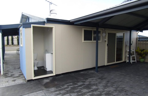 unit - open plan kitchen and living area with full size oven, portable hotplates, microwave, fridge/freezer, tv/dvd, split system reverse cycle air-conditioner, lounge, separate dining Main bedroom with queen bed, updated bathroom with vanity, walk-in shower and w/c.