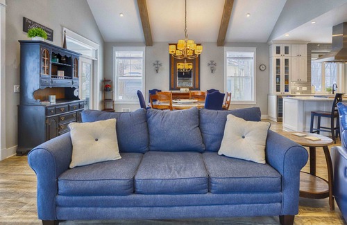 happily find that the first floor of blue skies is wheelchair accessible! inside, the foyer greats you To the right, an airy hallway leads the way past the powder room, first floor office and laundry rooms. The great room features a custom-built gas fireplace with comfortable furniture and beautiful views of the lake. A round dining table with seating for eight sits between the kitchen and living area.
