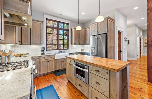 the primary bedroom boasts a california king bed, while the upstairs and downstairs guest rooms both have queen beds The downstairs Bunkroom has two sets of bunk beds (the lower bunk is a full-size, and the top bunk is a twin-size) and two twin-size trundle beds underneath. In addition to the amenities at the home, as a guest at Bluegill Lodge, you will also be able to enjoy the exclusive amenities within Camp Lake James for the duration of your stay—take a dip in the pool, explore the lake by kayak, grab a quick bite at the Canteen, curl up by the stone outdoor fireplace, and enjoy community-led activities to your heart's content.