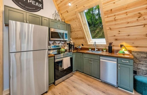 a-frame retreat just above downtown west jefferson This one-bedroom cabin features vaulted ceilings, a full kitchen, cozy electric fireplace, Smart TV, and a private XL hot tub nestled in nature. Only a 5 minute walk to the West Jefferson shops, art galleries, and restaurants in minutes. Don’t miss the free trolley running between Ashe County Cheese and Old Barn Winery.