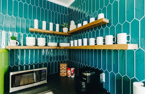 stay in the most unique and stylish rental in rock hill Located within walking distance to everything our city has to offer, this unit was custom designed by Blue Pineapple decorators with our guest's experience in mind. Work remotely on the 27" computer monitor and 47" desk, enjoy cooking a meal in the aesthetically beautiful, fully stocked kitchen with it's peacock colored picket tile and bright green SMEG fridge, or snuggle up on the chaise lounge sofa complete with comfy accent pillows to catch up on your favorite shows/movies on the 55" Samsung Smart TV.