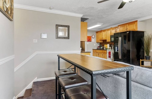 this second-floor, 2-bedroom, 1-bath apartment offers a cozy, open layout Relax in the master bedroom with a comfy King Bed or in bedroom two, which features a full bed. The spacious kitchen provides plenty of room to cook, while the living room is a haven of comfort with a mounted 65-inch TV and plush couches. Enjoy the breakfast bar, central AC/Heat, and a ceiling fan. Perfect lighting sets the mood, and a free WiFi connection ensures productivity.