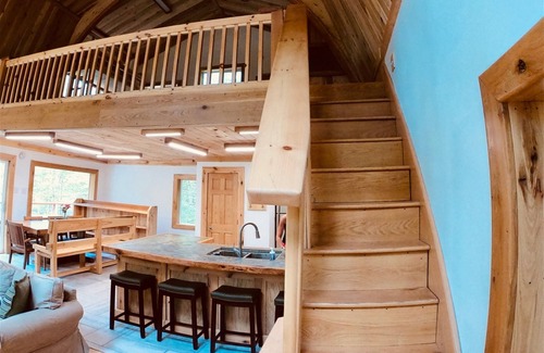 to access the cabin from the parking area, there is an uphill walk of 150' and then two flights of stairs, which lead to the first main porch and hot tub Just inside the front door, you'll be in an entryway with custom built shelves, hooks and benches for storage and gear. There are two bedrooms on this first level, one with a queen sized bed, the second with two sets of bunkbeds. The main bathroom is also located on this level with a custom concrete countertop inlaid with quartzite our kids harvested from the creekbed below, a large shower with a glass door, toilet and a new washer and dryer set for your use. a second full bathroom is located in the basement of the cabin - there are photos of our family building it together along the hallway down there! :)