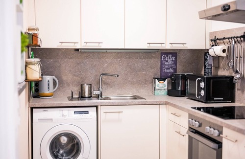 fully equipped kitchen with microwave, fridge, toaster, kettle, capsule coffee machine incl 2 coffee capsules, and washing machine