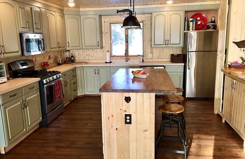inside, the main floor living space boasts a spacious open floor plan with a fireplace, an inviting living room and dining room overlooking the lake with a large table that seats 10 The open kitchen is fully equipped with a dishwasher, prep island with seating and everything you need to whip up delicious homemade meals and treats, so let your inner chef shine and delight your group with their favorite dishes. This floor also includes two comfortable bedrooms, one with a king bed and the other with a queen bed plus a full bath.