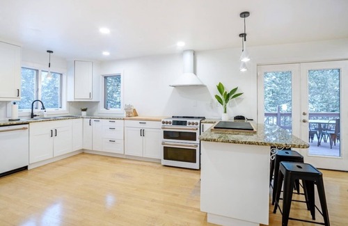 the newly remodeled home features 5 bedrooms, 3 bathrooms, kitchen, dining room, living room, sunporch, family room, garage space filled with games (including classic arcade games, pingpong, frisbee golf, basketball) an indoor climbing wall, and outdoor living spaces Every area of the home has plenty of seating, curious artwork and lots of fun touches to make your stay here memorable.
