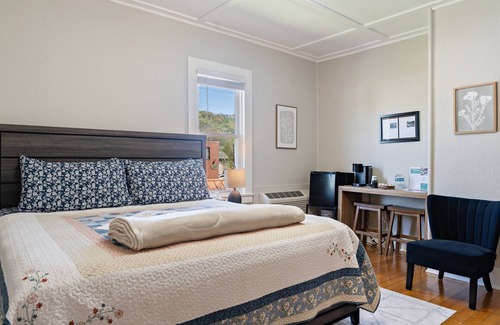 The Tellico Plains Inn, originally established in 1916, is in the heart of Tellico Plains and the start of the Cherohala Skyway. The Inn was rehabbed in 2023 with modern flare but staying true to the character of a 100+ year old Inn. It is within walking distance to the local shops and minutes away from the Cherokee National Forest (Bald River Falls, Indian Boundary, trout fishing, hiking, kayaking). The Byrum Room has a king bed, console/desk with stools, mini fridge, 55" smart TV, and the room also has its own ductless heating and cooling unit. The luxurious ensuite, full bathroom boasts a tub/shower combination with glass doors and tile walls.