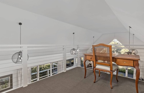 the upstairs level has two good sized, loft style bedrooms, each with an en-suite One bedroom has a queen bed, and the other has two king single beds. There is also an open mezzanine area set up with bean bags and extra TV for the kids, and a desk should you need a work area.