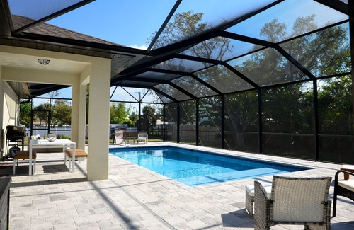 welcome to the grace place! a beautiful new construction home completed in 2021, located in fort myers, fl It's the perfect location to enjoy beaches, shopping, restaurants & more! Step into this very clean & bright, open floor plan home featuring 4 bedrooms (sleeping 8), 2 full bathrooms, stocked kitchen, washer/dryer & an outdoor grill. Relax outside in the heated pool with a tanning ledge surrounded by a screen enclosure, or enjoy dinner on the large patio surrounding the pool!.