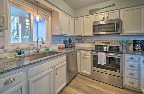 This first floor walkup condo has a beach cottage feel with all the modern conveniences. Load up your beach cart and spend all day chasing the sun (or kids!) between the pool and the ocean - they are steps away. An outside shower and a downstairs lockable storage closet means less sand and gear for you to worry about. Upon check in your linens will be fresh on the beds for you and hung on towel rods so that you don't have to bring them from home or unwrap expensive uncomfortable rental linens and spend the first hour of your vacation making beds (and this is included in the price of your rental without additional fee!) When the tides turn, settle in, watch TV or Netflix while you prepare meals on granite countertops in your fully stocked kitchen, and then have dinner watching the sunset from your private balcony. Blackout curtains, memory foam mattresses, and contemporary bedding mean the sound of the waves will be the last thing you hear before blissful slumber. The Oak Island Golf Course is right across the street or hop on a ferry in charming Southport over to the NC Aquarium in Fort Fisher. whatever you do, unplug the stress at home and plug in your vacation treat yo self mode!