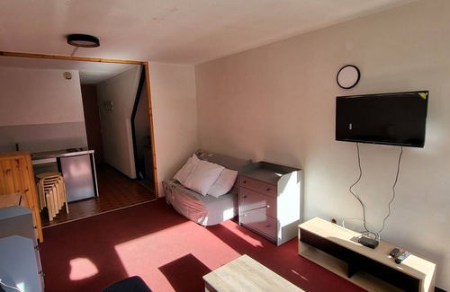 Résidence la Mongie Tourmalet at the foot of the slopes Bright studio of 23 m2 (3rd floor with elevator. 3 car parks nearby). South facing with balcony overlooking the slopes. Kitchen area with fridge, electric hob, microwave, oven, coffee maker, kettle, toaster, raclette grill. Dining area with folding table, Bathroom (wc, bathtub, towel dryer, hairdryer), TV, 2 Bz (140x190) & (160x190), duvets, cushions, protective cover, iron & ironing board..