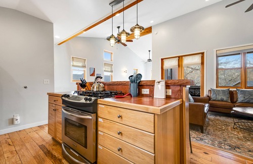 perfect for families or a group of friends, the home's interior is spacious and full of custom accents, artful decor, and high-end furnishings In the living area, settle in with a favorite cable series or DVD movie on the TV, or kick off your shoes and take a comfortable mid-day nap on either of two leather couches. You could also pour yourself a refreshing beverage and head onto the patio for beautiful views while you sip. When it's time to eat, whip up hearty homemade dishes in the open-concept kitchen with stainless steel appliances, granite countertops, and varied cookware for quick and easy meal prep. Serve up snacks on its ample counters and, when the main course is ready, eat together at the dining table or at the breakfast bar.