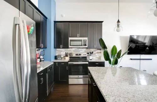 there's a fully stocked, modern kitchen with stainless appliances, a large island and bar stools We provide a Keurig coffee maker and free selection of K-cups, all dishware, silverware, cookware, bakeware, and cutlery needed for meal prep, plus a blender and toaster.