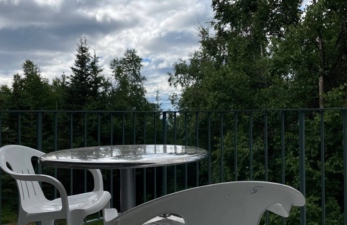 Anchorage Alaska. Large wooded lot on the beautiful hillside. Peaceful, private, spacious, bright & clean, rustic home on acre plus lot with vaulted open beam ceilings. 3 wood fire places -1 each per floor. Flowers, and open mountain inlet views/sunsets. 1-2 mi. from world class x-c skiing/bike, Hike & running trails. 35 mi. from Alyeska Resort, fishing, snow machining, 5 mi from shops/eating/movies/golf. Parking for RV, double carport, extra storage, 10 mi from Anchorage International Airport. 3+ bedrooms, can comfortably sleep 5+ (best suited for two couples or a family) , 2 decks, toaster, pro waffle iron, coffee maker, popcorn popper, blender etc, pans, spices, nice dishes, cups/ glasses, soaps, shampoo, laundry service, Guest Igloo, condiments, utensils, baggies, foil, gas grill, outdoor furniture, fans, books, binoculars, desk/work area, extra fridge/freezer. Everything you need to just walk in and enjoy..