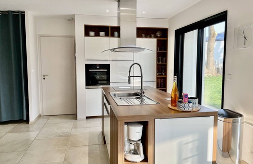 Contemporary house, 500m from Port Goret beach and the GR34 customs trail. Classified 4 stars, approved 4 ears Gites de France. Tastefully decorated and comfortable, high-end furniture, garden with terrace equipped with a spa "jacuzzi" 6 places. on one level, the house (105m2) has a living room of 45m2 with kitchen, 3 bedrooms directly overlooking the garden: