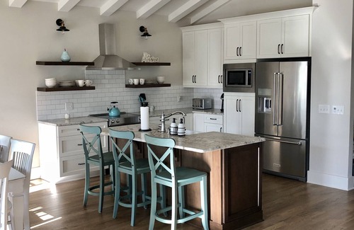 Walk up to our home with stair lighting leading to our double porch with an outdoor fireplace. Our home has a beautiful open concept with vaulted beamed ceilings and is tastefully decorated in a beachy decor. The kitchen has leathered granite,farmers sink,stainless steel appliances and everything you need to cook at home including a waffle maker,griddle,keurig machine, and toaster. There are 4 bar stools for the island and a table that seats 6 plus two more bar stools.