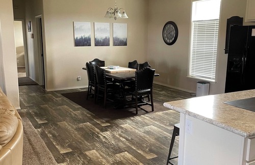 This is a four-bedroom home with a full kitchen, laundry, and a view of the mountains. It also has a spacious living room and free Wi-Fi. A town with a grocery store is nearby, and there are off-road trails and hiking in the area..