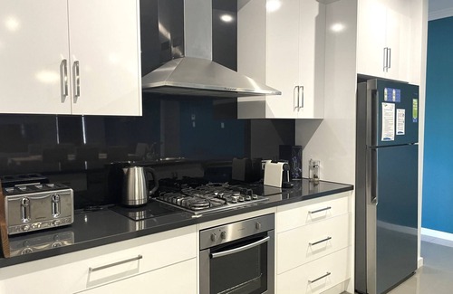 property details: 4 bedrooms - queen, queen, 2 x bunks (4 singles), queen Sleeps 10; Quilts, blankets and pillows provided – BYO sheets, pillowcases, towels, bathmats & tea-towels; OR optional linen hire $170 available through Country Getaways office; optional linen service fee $80 for beds to be made up. Portacot (guests need to bring all bedding to use). Ensuite bathroom adjoining master queen bedroom with walk-in shower, vanity & toilet; Main bathroom with bath, walk-in shower & vanity; Separate toilet. Ducted reverse cycle air-conditioning throughout; Ceiling fans in all bedrooms. Large television with USB & HDMI ports in main lounge room; WiFi for guests; Board games; Books. 2nd television with USB & HDMI ports in 2nd lounge room; Highchair. Fully equipped kitchen with gas stove, electric oven, microwave, coffee machine (guests need to bring Nespresso-compatible pods), dishwasher, and medium fridge/freezer. Top load washing machine; Iron; Ironing board; Clothesline. Shaded outdoor entertaining area; Hooded gas barbecue; Drinks fridge/freezer in courtyard area. Fenced yard with 6-foot fence; Lawned area. Off-street driveway parking for 2 cars; No guest access to shed. 10 minutes walk to beach. Sorry, pets not permitted..