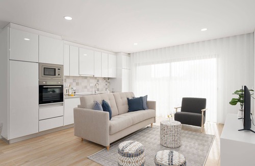 Coração de Burgau (Heart of Burgau) is a brand-new, bright, well-appointed modern apartment just 200 meters from the clear turquoise waters of Praia do Burgau—a stunning golden sand beach dramatically framed by steep cliffs.