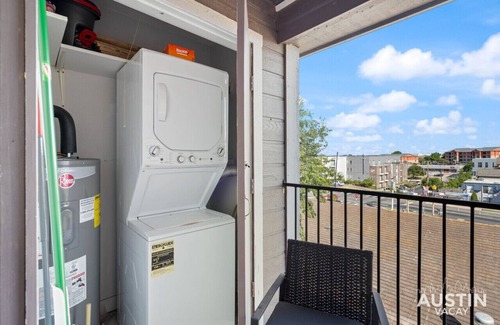 Welcome to your stylish Austin retreat! This third-floor apartment offers a cozy and well-designed space with a comfy full bed, a large smart TV, high-speed Wi-Fi, and a fully equipped kitchen with a dishwasher. Relax on the small patio, and enjoy the convenience of in-unit laundry. Free parking is available, and you`ll be just steps away from Austin`s top attractions, dining, and Lady Bird Lake.