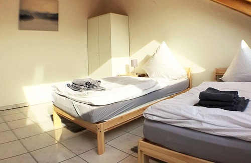 Very nice, large apartment in the light-flooded attic of a three-family house with three large bedrooms. Two of them are equipped with two single beds and one with three single beds. The apartment can accommodate up to 7 people.