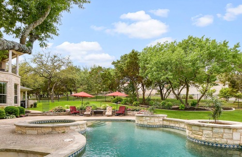 welcome to the above creekside estate in austin! this beautiful corner lot boasts plenty of space to enjoy the great outdoors There is a wet weather creek that runs through the back of this property. You will want to spend your time in the great back yard whether enjoying the pool and hot tub or playing cornhole or volleyball. There is a balcony with a comfortable sectional and outdoor TV. Indoors, you will enjoy a beautiful living area just off the spacious kitchen in this open floor plan. With two dining areas, there is plenty of space to enjoy meals together. Let us schedule a private chef for you! There is a media room upstairs for movie night. Should you need to get a little work done, you will find a well-appointed office where you can find the privacy and quiet space you need. This property is regularly set for 8 guests, but, with homeowner approval, can host as many as 14 guests with luxury Frontgate beds which would also be set with ABOVE standard luxury linens. A large group fee may apply. All guests must be pre-approved to rent this estate. A full guest list will be required. 30 night minimum. Great Location for Dell Match Play.