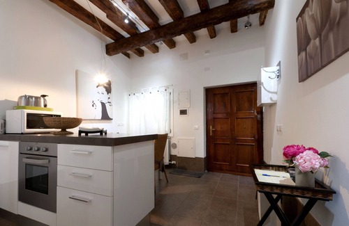 FEEL AT HOME :-) A charming, exquisite top luxury apartment, fully renovated in 2009, tastefully decorated with a predominantly modern feel. Living room with kitchenette, double bedroom, double-sofa-bed and a private internal courtyard. While externally the house looks as an ancient typical Venetian house, inside the apartment is completely renovated and fully equipped (washing machine, iron and board, air-conditioner, hoover, dishwasher, double sofa-bed, fridge, cooker, kettle, stove, coffee machine, towels and bed linen, pillows, blankets, stereo hi-fi, hairdryer, microwave, toaster, shower, heating, double bed 180x200, plasma TV, Wi-Fi internet ...): everything you need to feel at home! A very cozy and modern apartment: a quiet double-room with a big double-bed (180x200), baby crib on demand (5 euros per night), two bedside tables and an enormous wardrobe; an open living room with a very comfortable double sofa-bed and plasma TV; a fully equipped kitchen and a brand-new bath with shower. Usually the kitchen is provided of a choice of different teas, spices, sugar, dressing and other little things which you allow to do little snacks. The apartment is connected to Ca ’Annalaura 2 via the internal private courtyard where you can sit and enjoy the ancient spring and the old walls. The apartment is well central located but at the same time it is situated in a quiet narrow street. You can find it with Google maps writing "Calle della Pegola". It takes 10 minutes walk from S. Marco Square and in the neighborhood there are a lots of shops, restaurants, cafès and supermarkets. The apartment is 50 meters away from Riva Degli Schiavoni and from the water bus stop "Arsenale". In less than 5 minutes you can get to Via Garibaldi, a characteristic street of typical shops. Meanwhile, in less than ten minutes walk you can reach the Biennale. The splendid and famous Lido di Venezia beach is only two stops away by vaporetto (water bus). How to reach us: From the airport Marco Polo: you can take directly the vaporetto "Alilaguna - blue line" to get our apartment. From the train station: you can take the vaporetto line 1 or 4. 1. The apartment is for maximum 4 people. The cost is 10 euros more per night. The air conditioning and the heating are included in the price. Linen and towels are included. Breakfast is not included. Please note that for late check-in we ask for a charge that depends on the time of arrival: between 8 pm and 10 pm: € 30.00. After 10 pm: € 50.00. Stefano and Monica, the owners, wishes you the best stay ever in the magical Venice!.