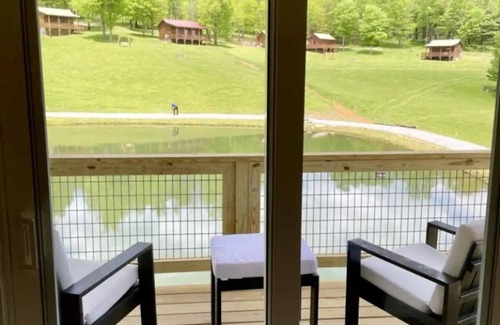 Large 4 Bedroom Cabin with a direct waterfront view! The largest of the Sky Retreat cabins, this cabin features a series of 8ft grand glass doors framing the pond view with it's beautiful fountain, 4 bedrooms, spacious 9ft ceilings, scenic porches with chairs, a dining veranda, a full kitchen with granite countertops, stocked with all the amenities of a full sized stove and oven, Bosch microwave drawer, full sized fridge, keriug coffee machine with k-cups provided, pots/pans, dishes/cutlery, etc. Two of the upstairs bedrooms each have king beds, and the third upstairs bedroom has a queen bed. The smaller downstairs bedroom has a double bed. All bed linens, bathroom towels, toilet paper, complimentary shampoo and soap are provided. The master bedroom upstairs has it’s own private internal full bathroom/shower. The two other upstairs bedrooms share a full bathroom/shower that is entered from the hallway directly outside their doors. The downstairs bedroom has it’s own bathroom/shower that is entered from directly outside it’s door and can also be used by the living room. It is fully air-conditioned/heated. Enjoy the all the conveniences of wifi and cable tv. A perfect place to stay with family/friends to enjoy all the retreat has to offer!.