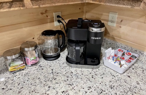 the main level features a gourmet kitchen with waffle bar, dining room, family room, and 2 bedroom suites with bathrooms When you wake up, the fully stocked kitchen is ready for you to prepare all your favorite meals. This newly built cabin features a brand new stainless steel oven, gas stove, microwave, and refrigerator with an ice maker. Other appliances include a Crockpot, waffle maker, toaster, blender, keurig & drip coffee maker, Moka pot espresso maker, and all the cookware necessary to make a gourmet meal. A washer and dryer are located on the first level and a gas grill is also available. The main level also features a covered deck, highlighted by a wood-burning outdoor fireplace and sitting area.
