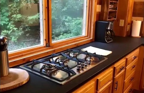 cook up your favorite meal in our kitchen fitted with a 4 burner gas stove, full sized refrigerator, toaster oven (no full sized oven), microwave, coffee maker, a blender, dinnerware, pots, pans and cooking utensils