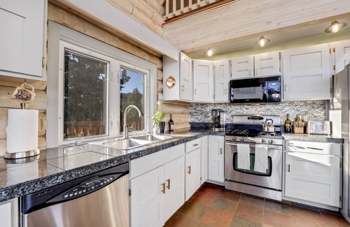 at the top, you are greeted by a beautiful log home with a massive multi-level wrap around deck to soak in the views Inside, you will be wowed by the warmth and beauty of the modern log interior w/vaulted wood ceilings, wood floors and floor to ceiling windows. Log pillars span the distance of both floors. The living room has a wide screen TV to watch a movie with rh family or you can see and look out at the large picture frame windows and gaze a Pike’s Peak.