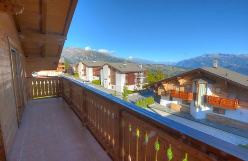 4-room chalet 130 m2 on 2 levels Comfortable furnishings: living/dining room with open-hearth fireplace, dining nook, digital TV and DVD. Open kitchen (oven, dishwasher, 4 ceramic glass hob hotplates, microwave, electric coffee machine, raclette grill, fondue Set (cheese)). Sep. WC. Upper floor: 1 double bedroom with bath/shower/WC. Exit to the balcony. 2 rooms, each room with 1 bed and 1 pull-out bed (2 pers.), shower/WC. Exit to the balcony. Balcony 11 m2, large terrace. Terrace furniture. Marvellous panoramic view of the mountains and the countryside. Facilities: Internet (WiFi, free). Parking (2 cars), garage. Please note: non-smokers only.