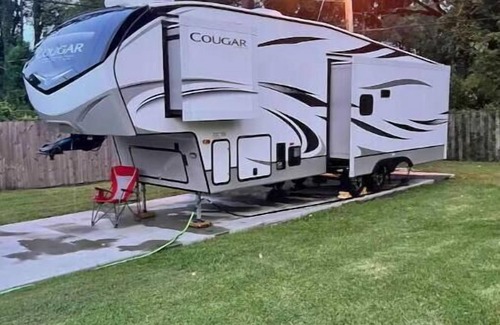 this space is a 2022 cougar 30rls Gorgeous 5th wheel camper. Showroom condition, setup on my property in beautiful Halcyon Bluff. This unit is designed for 2 people to travel the country as full time campers. 1 bedroom, 1 head with stand up shower, the rest is living space.