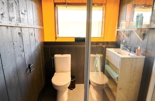 This luxury Villatent XL with private bathroom is fully equipped. Perfect for a vacation in nature. In this tent you will find a full bathroom with its own shower, toilet and sink. The robust safari tent in Wilsum has a sturdy wooden frame and is equipped for up to six persons. Naturally, the tent is fully equipped so that you lack nothing.