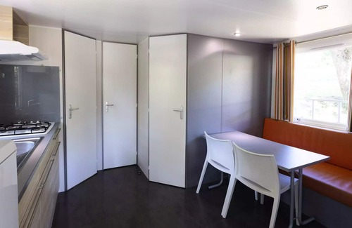 mobile home ohara 27m² 3 rooms 4 people with a living room with tables and benches, a kitchen area, a bedroom with a double bed, a room with 2 single beds, a bathroom with separate shower and toilet