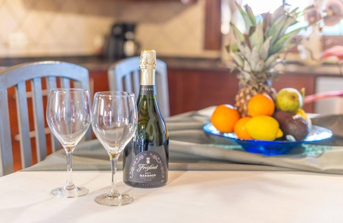 this 170 m2 house is divided into two floors and accommodates 7 people There are four bedrooms: one on the ground floor with air conditioning, mountain views, and an en-suite bathroom, equipped with a bath; and three more double bed bedrooms on the first floor, with air conditioning, too. There are two bathrooms for the rest of the house, one with a bath on the ground floor and another with a shower on the first floor. A crib is available in case you need one. You can relax in the two living rooms of the house: one of them is quieter and equipped with four sofas, satellite and TV; and the other, part of living-dining room with fitted kitchen, has a table, chairs, two sofas and air conditioning. The fully-equipped kitchen has a hob-ceramic hob and there is an iron, an ironing board and a washing machine.
