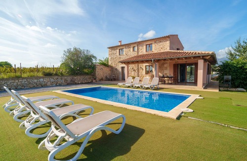2 km from Inca: Very large, beautiful, comfortable farm estate "Can Blancos", 2 storeys, renovated. Outside the resort, in a sunny position, 2 km from the edge of the forest, 25 km from the sea, in the countryside. Private: natural state property (fenced), large, beautiful garden with wildlife garden and trees, swimming pool angular (7 x 4 m, seasonal availability: 01.Jan. - 31.Dec.). Outdoor shower, table tennis, patio, arbour, pergola, garden furniture, barbecue. In the house: internet access, WiFi, storage room for bicycles, air conditioning, washing machine. Roofed, parking at the house on the premises. Shop 2.5 km, supermarket 1.5 km, shopping centre 15 km, restaurant 2 km, bar 1.5 km, bakery 1.5 km, 20 minute walk to the centre, bus stop 1.8 km, railway station 2.7 km, sandy beach 25 km, rocky beach 28 km. Golf course (18 hole) 29 km, tennis 2.5 km. Nearby attractions: Puig de Santa Magdalena, Museo del Calzado, Monasterio de Lluc, saclasta.com. Please note: suitable for families, suitable for seniors. Object suitable for 8 adults. The owner does not accept any youth groups. Loading and unloading of baggage is possible at the holiday house. Animals in the neighbourhood.