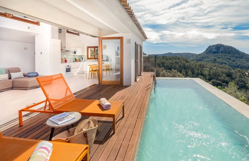 The modern holiday home with pool Can Jordi is perched on a mountain in Galilea, in the west of Majorca. Due to its exposed location, the villa enjoys overwhelming panoramic view over Galilea, the hilly landscape - all the way to the sea. Here you will experience an extraordinary and exclusive vacation. You live idyllically and are surrounded by nature, hear only the wind rustling and experience this incredible panoramic view, which impresses you every day anew. The perfect domicile to leave everyday life behind and recharge your batteries from the tranquillity.