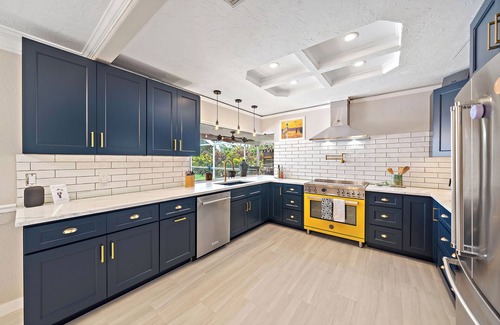 • gourmet kitchen – this home features a vibrant and fully renovated gourmet kitchen overlooking the outdoor patio and pool area with modern appliances and all the essentials you'll need for cooking at home Perfect for the chef or culinary enthusiast. It has a large kitchen island with additional seating (and games) that opens up to the dining area with a cozy fireplace.