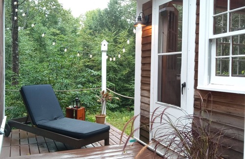Nestled deep in the forest on the outskirts of a resort town, this cottage is a dream. Built as a 1600's cape replica it features a custom kitchen and natural woodwork throughout. With 3 bedrooms including 1 first floor master bedroom with internet tv and attached bathroom connecting the bath and laundry room to the kitchen and cozy den. Upstairs, 2 full beds with vintage quilts and antique family furniture. In the custom, fully equipped kitchen, attached to a sitting den by a bar table and stools, guests will feel right at home with a wood burning glass front woodstove to add extra warmth and cozy ambiance. The 2 full bathrooms are equipped with all the essentials and hot filtered artesian water. Reliable propane heating throughout to keep the house warm in the winter months. Located on Chipmunk Falls near the Weare/Henniker town line, attractions include the hiking trail through the forest to the waterfall and an abandoned cabin. Lake Horace is a short drive at the bottom of the long winding dirt road, with boat access and a small picnic park and beach. Just next door, Pats Peak Ski Resort is a dazzling backdrop overlooking the charming college town, with restaurants overlooking the Contoocook river with a quaint New England covered bridge. Perfect for any season. The fall foliage is an exceptional spectacle..