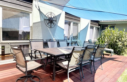 Positioned atop Frankston's prestigious Oliver's Hill & within footsteps to Frankston’s stunning foreshore, Capelink is a much-loved family beach house, features 4BdRms/2BthRms/2 living areas, can accommodate up to 8 ppl. Shaded outdoor decking with multiple loungers and a front porch with couches makes this Hamptons-inspired house perfect for entertaining.